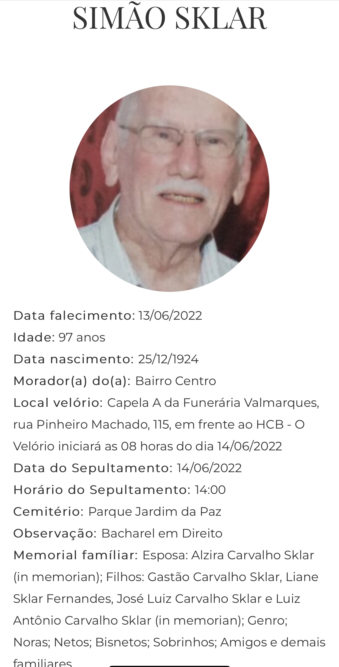 Falecimentos Falecimento / Simão Sklar admin 14 de junho de 2022 Post navigation Previous: Confira os resultados das loterias do dia 13/06Next: Falecimento / Luci Plates da Silva Mais notícias Falecimentos MARION DA SILVA (SÃO NUNCA) Francis Soares 21 de fevereiro de 2025 Falecimentos ROMANI KEGLER NUNES Francis Soares 17 de fevereiro de 2025 Falecimentos ROMARINO “EDILON CARDOSO” PEREIRA Francis Soares 17 de fevereiro de 2025 Deixe um comentário Cancelar respostaO seu endereço de e-mail não será publicado. Campos obrigatórios são marcados com *Comentário * Nome * E-mail * Site Salvar meus dados neste navegador para a próxima vez que eu comentar. Δ
