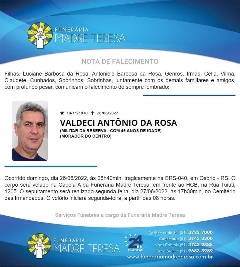 Falecimentos Falecimento / Valdeci Antônio da Rosa admin 26 de junho de 2022 Post navigation Previous: Cachoeirense morre em acidente no litoral.Next: SMEd recebe carros da Receita Federal e vai utilizar para atendimento aos alunos da rede Mais notícias Falecimentos MARION DA SILVA (SÃO NUNCA) Francis Soares 21 de fevereiro de 2025 Falecimentos ROMANI KEGLER NUNES Francis Soares 17 de fevereiro de 2025 Falecimentos ROMARINO “EDILON CARDOSO” PEREIRA Francis Soares 17 de fevereiro de 2025 Deixe um comentário Cancelar respostaO seu endereço de e-mail não será publicado. Campos obrigatórios são marcados com *Comentário * Nome * E-mail * Site Salvar meus dados neste navegador para a próxima vez que eu comentar. Δ