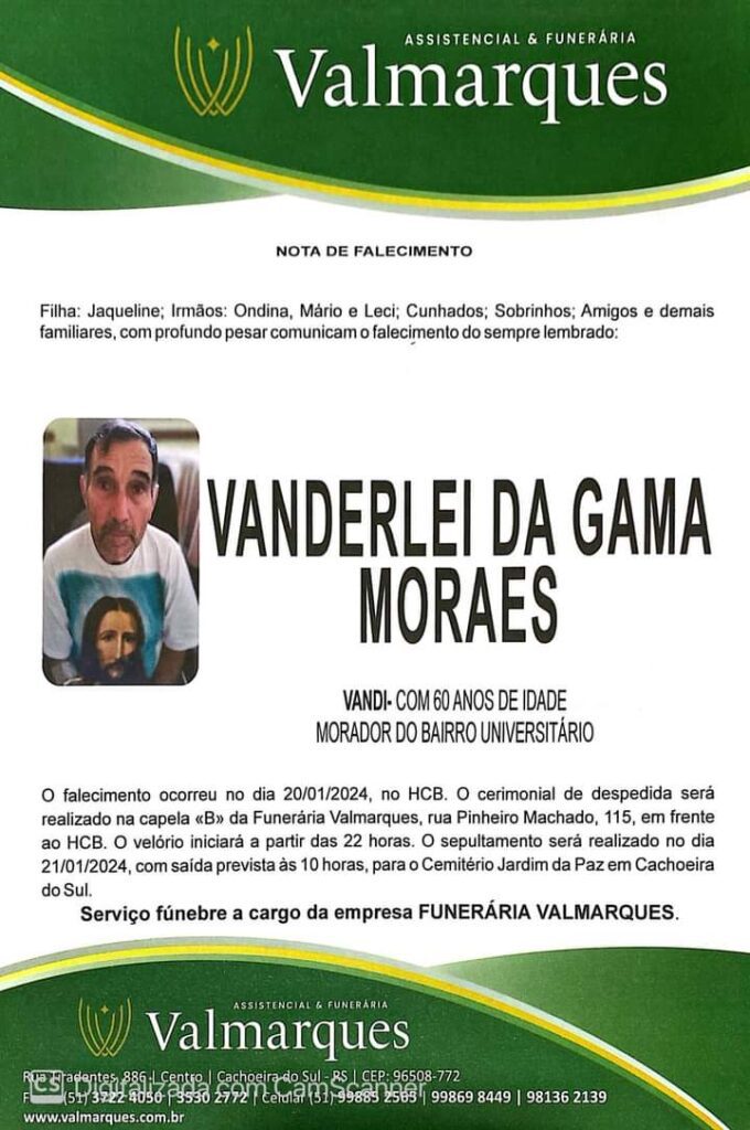Falecimentos FALECIMENTO: VANDERLEI DA GAMA MORAES Francis Soares 21 de janeiro de 2024 Post navigation Previous: Governador se reúne com concessionárias para acompanhar trabalho de restabelecimento da energia elétrica no RS após temporalNext: Instituto-Geral de Perícias orienta que não é preciso ter pressa para obter nova Carteira de Identidade Nacional Mais notícias Falecimentos MARION DA SILVA (SÃO NUNCA) Francis Soares 21 de fevereiro de 2025 Falecimentos ROMANI KEGLER NUNES Francis Soares 17 de fevereiro de 2025 Falecimentos ROMARINO “EDILON CARDOSO” PEREIRA Francis Soares 17 de fevereiro de 2025 Deixe um comentário Cancelar respostaO seu endereço de e-mail não será publicado. Campos obrigatórios são marcados com *Comentário * Nome * E-mail * Site Salvar meus dados neste navegador para a próxima vez que eu comentar. Δ