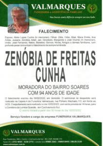 Falecimentos Falecimento / Zenóbia de Freitas Cunha admin 10 de fevereiro de 2022 Post navigation Previous: Confira os resultados das loterias do dia 09/02!Next: Quem cobra mais? Veja ranking dos maiores cachês da música brasileira. Mais notícias Falecimentos MARION DA SILVA (SÃO NUNCA) Francis Soares 21 de fevereiro de 2025 Falecimentos ROMANI KEGLER NUNES Francis Soares 17 de fevereiro de 2025 Falecimentos ROMARINO “EDILON CARDOSO” PEREIRA Francis Soares 17 de fevereiro de 2025 Deixe um comentário Cancelar respostaO seu endereço de e-mail não será publicado. Campos obrigatórios são marcados com *Comentário * Nome * E-mail * Site Salvar meus dados neste navegador para a próxima vez que eu comentar. Δ