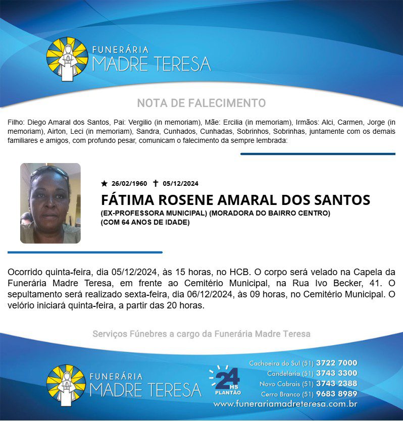 Falecimentos FÁTIMA ROSENE AMARAL DOS SANTOS Francis Soares 6 de dezembro de 2024 Post navigation Previous: ACOMPANHAMENTO SEMANAL DE PREÇOS RECEBIDOS PELOS PRODUTORES NO ESTADONext: ARLINDO MACHADO GOMES Mais notícias Falecimentos MARION DA SILVA (SÃO NUNCA) Francis Soares 21 de fevereiro de 2025 Falecimentos ROMANI KEGLER NUNES Francis Soares 17 de fevereiro de 2025 Falecimentos ROMARINO “EDILON CARDOSO” PEREIRA Francis Soares 17 de fevereiro de 2025 Deixe um comentário Cancelar respostaO seu endereço de e-mail não será publicado. Campos obrigatórios são marcados com *Comentário * Nome * E-mail * Site Salvar meus dados neste navegador para a próxima vez que eu comentar. Δ