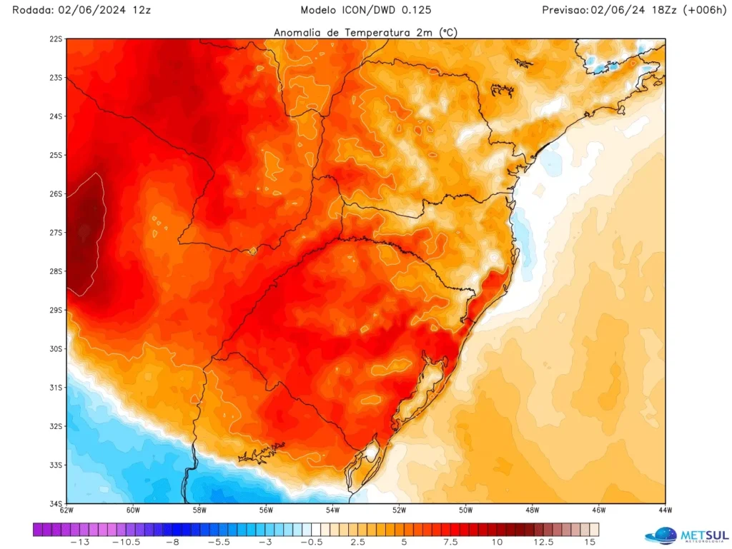 Mapa de anomalia da temperatura (desvio da média) na tarde desta segunda por dados do modelo alemão Icon | DWD/METSUL METEOROLOGIA