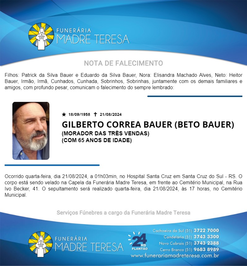 Falecimentos GILBERTO CORREA BAUER (BETO BAUER) Francis Soares 23 de agosto de 2024 Post navigation Previous: IVO ISIDOR GEWEHRNext: RAMIRO LOPES (MIRO MOLDURAS) Mais notícias Falecimentos MARION DA SILVA (SÃO NUNCA) Francis Soares 21 de fevereiro de 2025 Falecimentos ROMANI KEGLER NUNES Francis Soares 17 de fevereiro de 2025 Falecimentos ROMARINO “EDILON CARDOSO” PEREIRA Francis Soares 17 de fevereiro de 2025 Deixe um comentário Cancelar respostaO seu endereço de e-mail não será publicado. Campos obrigatórios são marcados com *Comentário * Nome * E-mail * Site Salvar meus dados neste navegador para a próxima vez que eu comentar. Δ