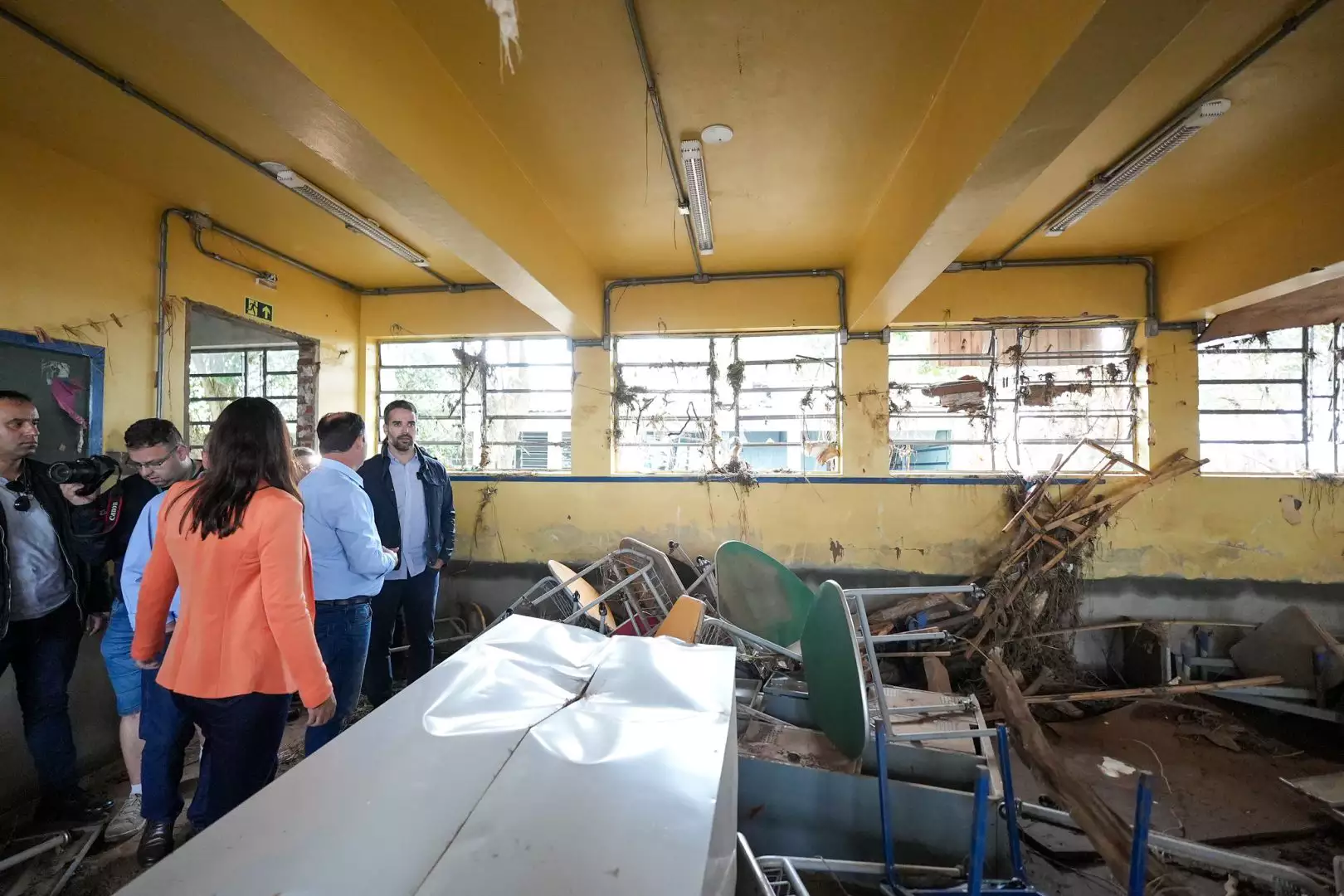 Após a vistoria do terreno, Leite e os secretários de Habitação e Regularização Fundiária, Carlos Gomes, da Educação, Raquel Teixeira, de Logística e Transportes, Juvir Costella, e da Reconstrução Gaúcha, Pedro Capeluppi, foram até a Escola Estadual Adelina Isabela Konzen. A instituição está recebendo estudantes da Escola Mariante, que foi atingida pela enchente. O governador falou à comunidade escolar sobre a intenção do governo de realizar a reforma do ginásio esportivo.
