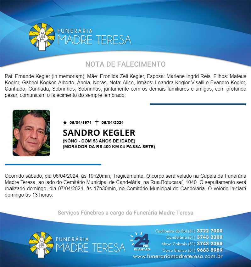 O sepultamento de Sandro Kegler ocorreu na tarde de domingo (7) no Cemitério Municipal de Candelária.