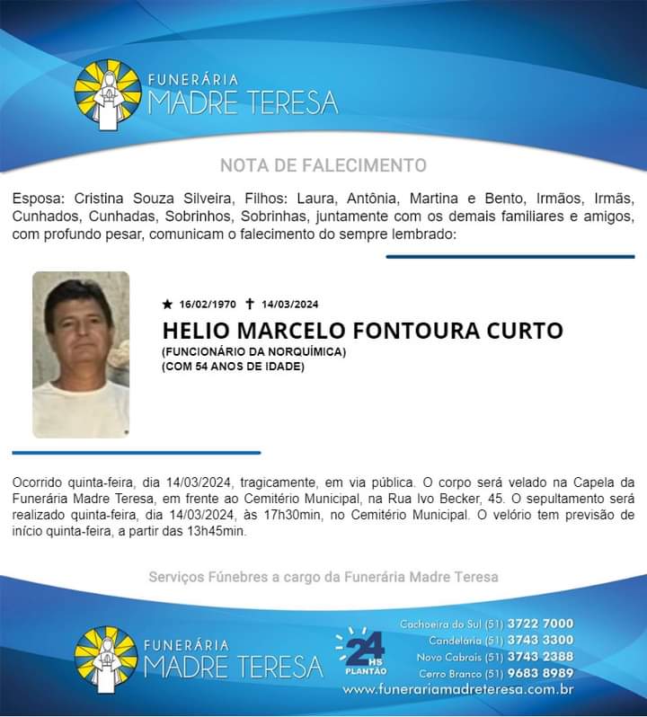 Cachoeira do Sul, o acidente foi registrado no km 398 da BR-153. De acordo com a Polícia Rodoviária Federal (PRF), uma caminhonete Hilux e um carro Zafira colidiram frontalmente na altura do km 398, por volta das 2h. A colisão foi seguida de capotamento. A vitíma foi identificada como Hélio Marcelo Fontoura Curto, 54 anos Outra pessoa ficou ferida. O motorista da Hilux fugiu do local deixando o veículo.