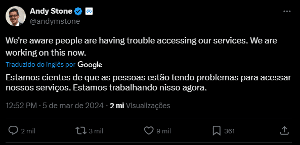 Com o Instagram e o Facebook fora do ar, o head de comunicação da Meta, Andy Stone, anunciou no X (antigo Twitter) que a empresa está ciente que usuários estão tendo problemas nas plataformas e que estão trabalhando para solucioná-lo.