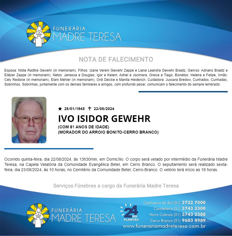 Falecimentos IVO ISIDOR GEWEHR Francis Soares 23 de agosto de 2024 Post navigation Previous: INAR DE FREITAS RODRIGUESNext: GILBERTO CORREA BAUER (BETO BAUER) Mais notícias Falecimentos MARION DA SILVA (SÃO NUNCA) Francis Soares 21 de fevereiro de 2025 Falecimentos ROMANI KEGLER NUNES Francis Soares 17 de fevereiro de 2025 Falecimentos ROMARINO “EDILON CARDOSO” PEREIRA Francis Soares 17 de fevereiro de 2025 Deixe um comentário Cancelar respostaO seu endereço de e-mail não será publicado. Campos obrigatórios são marcados com *Comentário * Nome * E-mail * Site Salvar meus dados neste navegador para a próxima vez que eu comentar. Δ