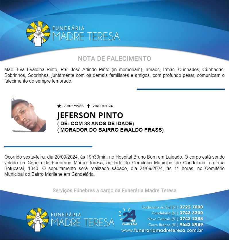 Falecimentos JEFERSON PINTO Francis Soares 21 de setembro de 2024 Post navigation Previous: ANTONIO SAQUINext: JOAQUIM MILANESI Mais notícias Falecimentos MARION DA SILVA (SÃO NUNCA) Francis Soares 21 de fevereiro de 2025 Falecimentos ROMANI KEGLER NUNES Francis Soares 17 de fevereiro de 2025 Falecimentos ROMARINO “EDILON CARDOSO” PEREIRA Francis Soares 17 de fevereiro de 2025 Deixe um comentário Cancelar respostaO seu endereço de e-mail não será publicado. Campos obrigatórios são marcados com *Comentário * Nome * E-mail * Site Salvar meus dados neste navegador para a próxima vez que eu comentar. Δ