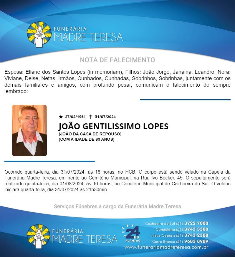 Falecimentos JOÃO GENTILISSIMO LOPES Francis Soares 6 de agosto de 2024 Post navigation Previous: SANTA HILDA LOPES RIBEIRONext: NEDY PEIXOTO DE FREITAS Mais notícias Falecimentos MARION DA SILVA (SÃO NUNCA) Francis Soares 21 de fevereiro de 2025 Falecimentos ROMANI KEGLER NUNES Francis Soares 17 de fevereiro de 2025 Falecimentos ROMARINO “EDILON CARDOSO” PEREIRA Francis Soares 17 de fevereiro de 2025 Deixe um comentário Cancelar respostaO seu endereço de e-mail não será publicado. Campos obrigatórios são marcados com *Comentário * Nome * E-mail * Site Salvar meus dados neste navegador para a próxima vez que eu comentar. Δ