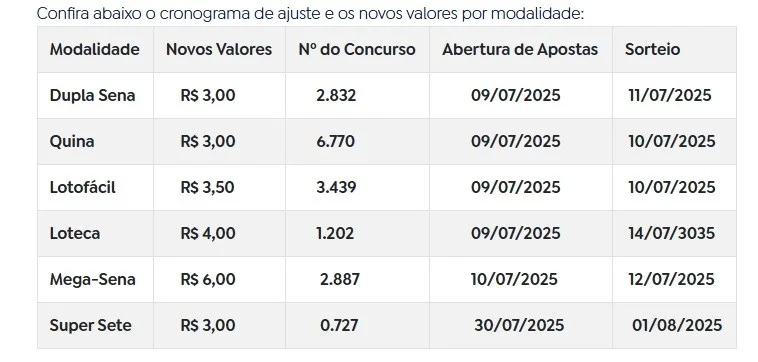 A Caixa Econômica Federal anunciou que os preços dos jogos das Loterias Caixa serão reajustados a partir da próxima quarta-feira, 9 de julho. O aumento médio será de 21,7% e abrange as modalidades Mega-Sena, Quina, Lotofácil, Dupla Sena, Loteca e Super Sete.