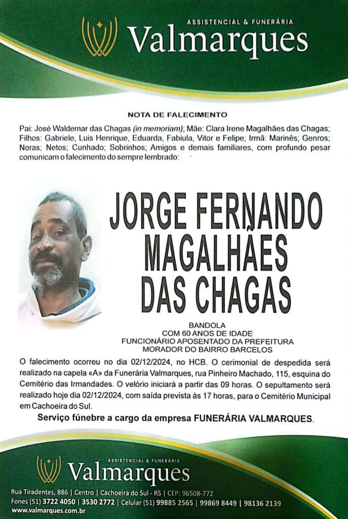 Falecimentos JORGE FERNANDO MAGALHÃES DAS CHAGAS Francis Soares 2 de dezembro de 2024 Post navigation Previous: Temporal atinge RS e provoca estragos em diversas cidadesNext: ANA LUCIA DE OLIVEIRA LACERDA Mais notícias Falecimentos MARION DA SILVA (SÃO NUNCA) Francis Soares 21 de fevereiro de 2025 Falecimentos ROMANI KEGLER NUNES Francis Soares 17 de fevereiro de 2025 Falecimentos ROMARINO “EDILON CARDOSO” PEREIRA Francis Soares 17 de fevereiro de 2025 Deixe um comentário Cancelar respostaO seu endereço de e-mail não será publicado. Campos obrigatórios são marcados com *Comentário * Nome * E-mail * Site Salvar meus dados neste navegador para a próxima vez que eu comentar. Δ
