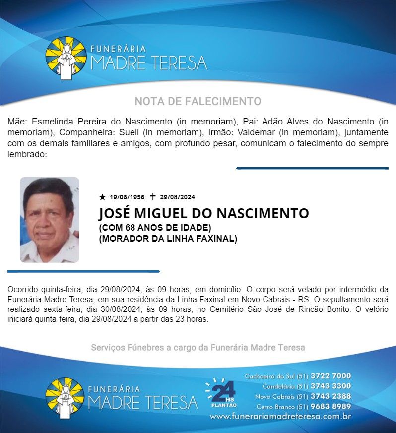 Falecimentos JOSÉ MIGUEL DO NASCIMENTO Francis Soares 31 de agosto de 2024 Post navigation Previous: MARIA LUIZA GUEDES DA FONTOURANext: ARI AGNE RIBEIRO Mais notícias Falecimentos MARION DA SILVA (SÃO NUNCA) Francis Soares 21 de fevereiro de 2025 Falecimentos ROMANI KEGLER NUNES Francis Soares 17 de fevereiro de 2025 Falecimentos ROMARINO “EDILON CARDOSO” PEREIRA Francis Soares 17 de fevereiro de 2025 Deixe um comentário Cancelar respostaO seu endereço de e-mail não será publicado. Campos obrigatórios são marcados com *Comentário * Nome * E-mail * Site Salvar meus dados neste navegador para a próxima vez que eu comentar. Δ