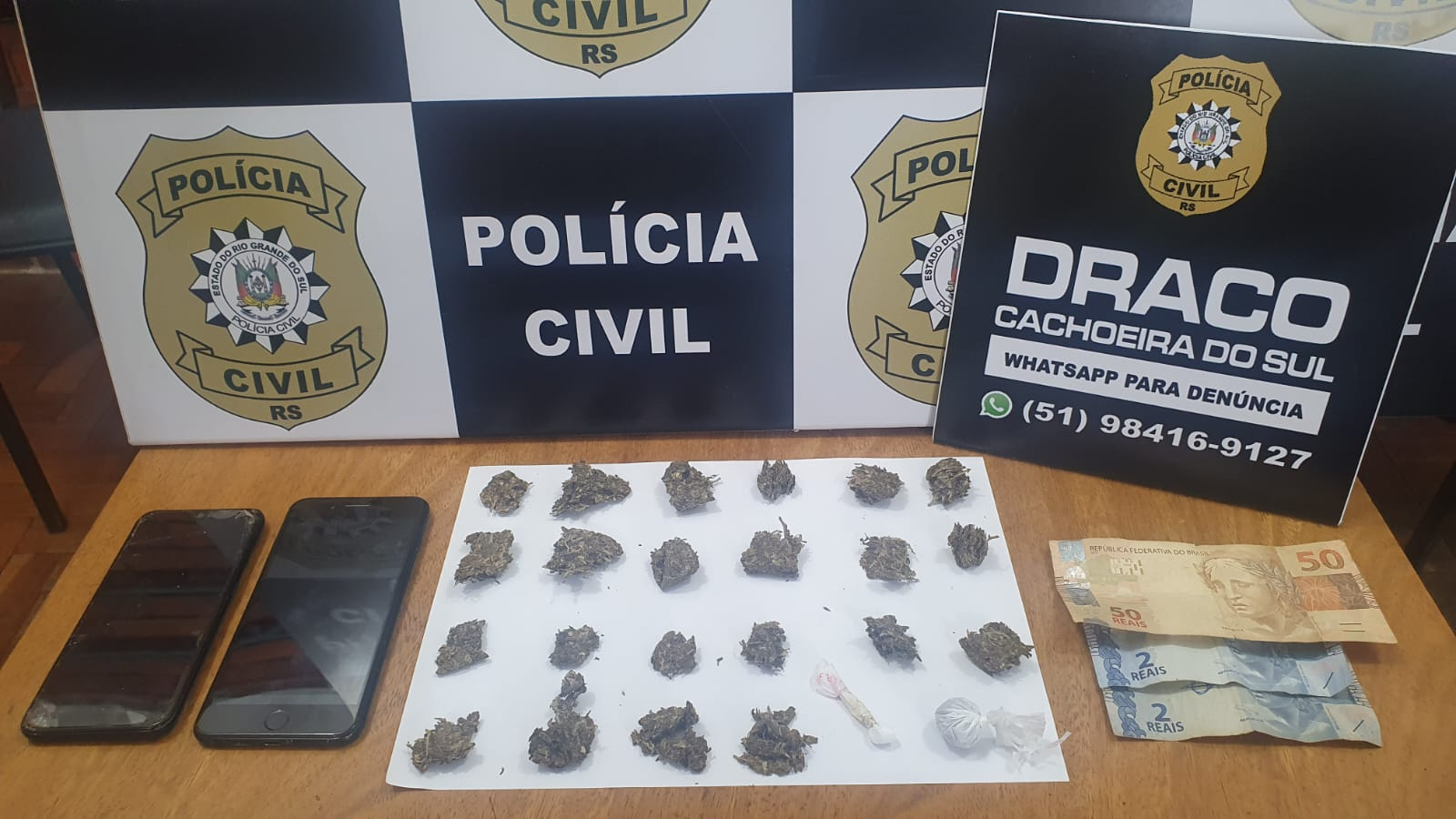 A Polícia Civil, através da DRACO de Cachoeira do Sul prendeu em flagrante na tarde de hoje (26/09/2022), no bairro Santa Helena, um homem de 18 anos, pelos crimes de Tráfico de Drogas. Foram apreendidos diversas porções de maconha pesando o total de 48 gramas, uma porção de cocaína, celulares, dinheiro e um veículo VW Parati utilizado para a entrega da droga.
