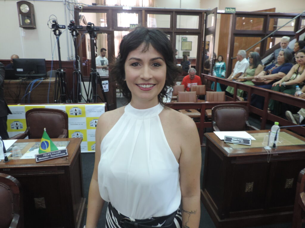 A vereadora Ana Melo (PP) chamou a atenção ao usar o traje típico de prenda, tradicional no Rio Grande do Sul, durante a cerimônia. Seu vestido em tons de verde foi elogiado pelos presentes e reforçou a identidade cultural gaúcha no evento.