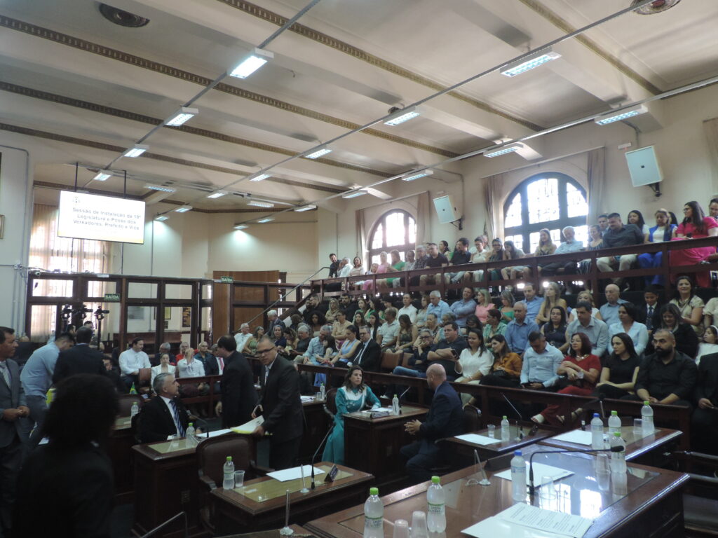 Na manhã de quarta-feira, 1º de janeiro, o Prefeito Leandro Balardin (PSDB), a vice-prefeita Dulce Lopes e os 15 vereadores eleitos para a 19ª Legislatura tomaram posse em uma sessão solene realizada no plenário do Palácio João Neves da Fontoura. A cerimônia contou com grande público, que lotou as dependências da Câmara Municipal.