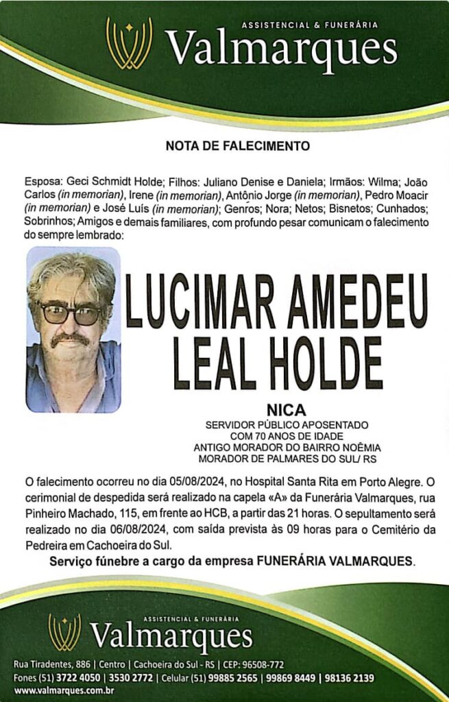 Falecimentos LUCIMAR AMEDEU LEAL HOLDE Francis Soares 6 de agosto de 2024 Post navigation Previous: ARI MACHADO GOMESNext: FABIO DORNELES HOPPE Mais notícias Falecimentos MARION DA SILVA (SÃO NUNCA) Francis Soares 21 de fevereiro de 2025 Falecimentos ROMANI KEGLER NUNES Francis Soares 17 de fevereiro de 2025 Falecimentos ROMARINO “EDILON CARDOSO” PEREIRA Francis Soares 17 de fevereiro de 2025 Deixe um comentário Cancelar respostaO seu endereço de e-mail não será publicado. Campos obrigatórios são marcados com *Comentário * Nome * E-mail * Site Salvar meus dados neste navegador para a próxima vez que eu comentar. Δ
