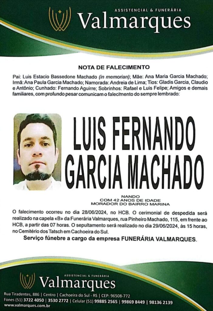 Falecimentos LUIS FERNANDO GARCIA MACHADO Francis Soares 29 de junho de 2024 Nossos pesares aos familiares e amigos. Post navigation Previous: UCAB recebe carreta de doações de Goiânia-GONext: Corpo de Homem Desaparecido é Encontrado Próximo à Ferroviária no Bairro Funcap Mais notícias Falecimentos MARION DA SILVA (SÃO NUNCA) Francis Soares 21 de fevereiro de 2025 Falecimentos ROMANI KEGLER NUNES Francis Soares 17 de fevereiro de 2025 Falecimentos ROMARINO “EDILON CARDOSO” PEREIRA Francis Soares 17 de fevereiro de 2025 Deixe um comentário Cancelar respostaO seu endereço de e-mail não será publicado. Campos obrigatórios são marcados com *Comentário * Nome * E-mail * Site Salvar meus dados neste navegador para a próxima vez que eu comentar. Δ