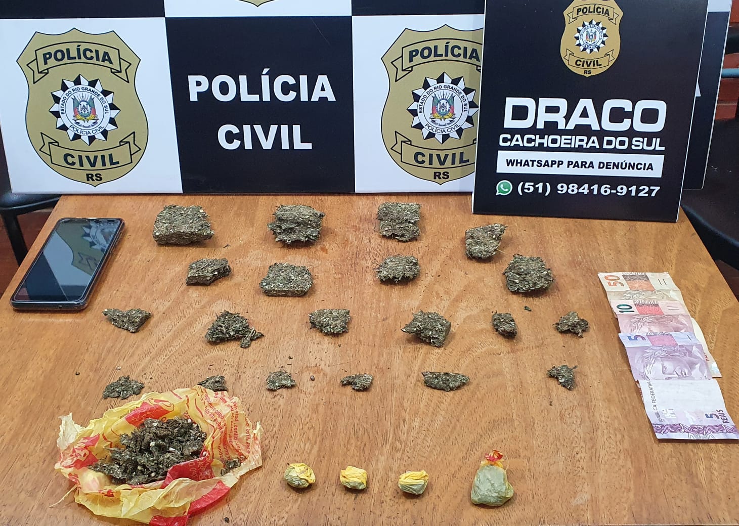 A Polícia Civil, através da DRACO de Cachoeira do Sul, prendeu em flagrante na manhã de hoje (22/07/2022), no bairro Medianeira, uma mulher de 33 anos, pelo crime de Tráfico de Drogas. Na ação foram apreendidos 175 gramas de maconha, telefone celular e R$ 65,00.