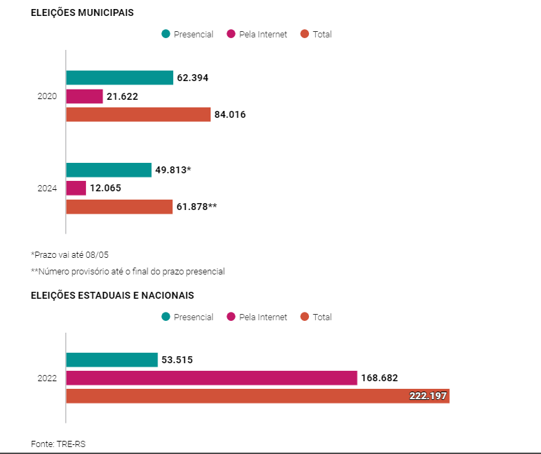 No entanto, esta exigência retornou, no Rio Grande do Sul, em 2023, valendo para as eleições municipais de 2024. Ou seja, para o pleito deste ano, os cidadãos aptos a emitir o título eleitoral pela primeira vez até poderiam fazer o pedido pela internet, mas, de qualquer forma, precisavam comparecer presencialmente em data agendada a uma unidade de atendimento ao eleitor ligada ao TRE-RS para fazer o cadastro biométrico.