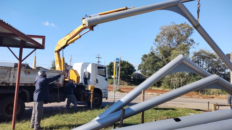 O pórtico que será instalado na BR 153 (Bairro Fátima) entrou em uma nova etapa na última semana. A meta agora é unir esforços para realizar a terraplanagem, transporte de materiais e calçamento da área. Parte da estrutura foi transportada nesta quarta-feira e a instalação será nesta quinta-feira, com auxílio do Exército. A obra está sendo feita através da parceria entre a Prefeitura de Cachoeira do Sul e a Cooperativa Sicredi Centro Leste RS, que ficou responsável pela organização do consórcio de patrocinadores da obra.
