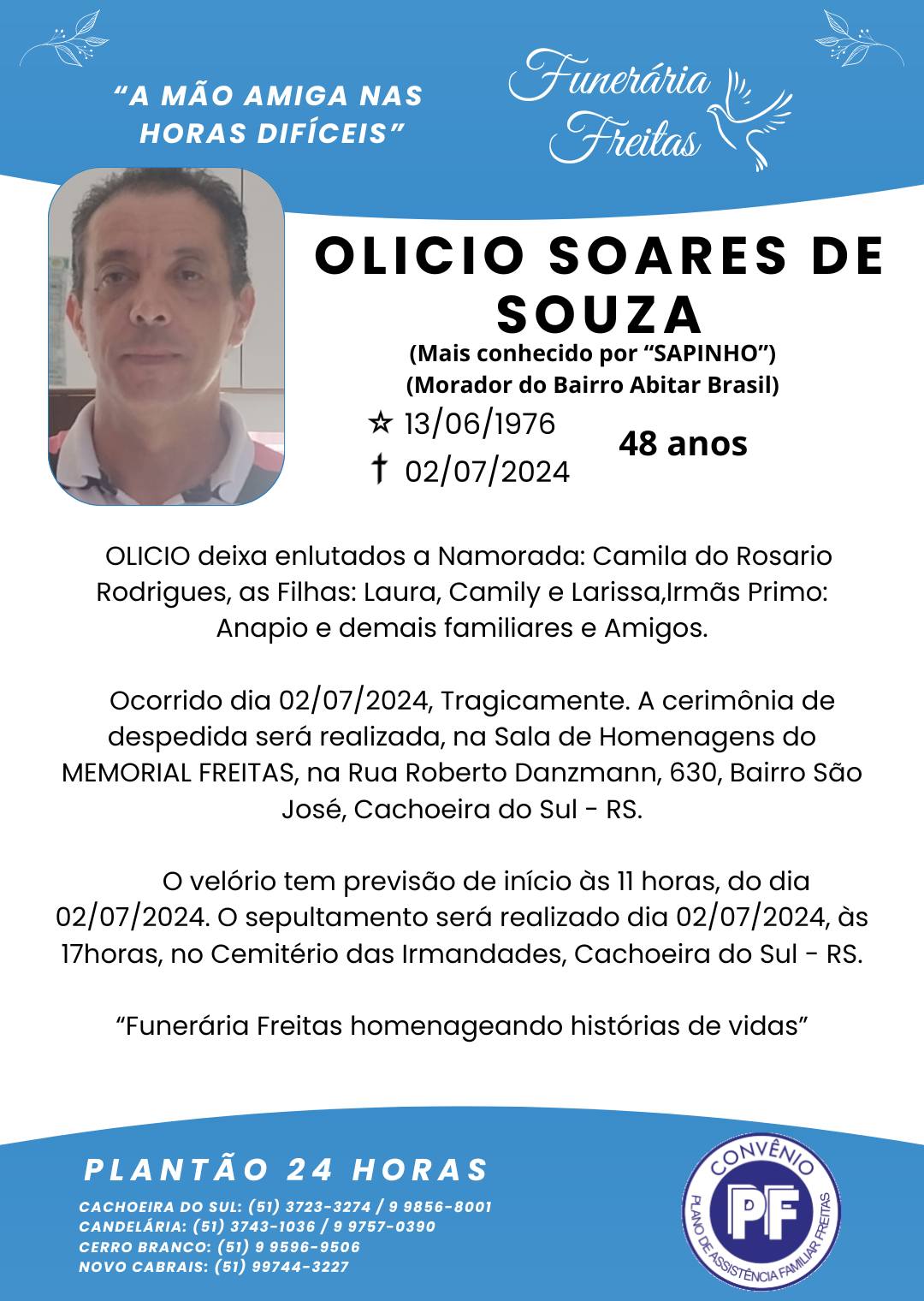 Falecimentos OLICIO SOARES DE SOUZA Francis Soares 2 de julho de 2024 Post navigation Previous: NELY ROSA DO PRADONext: Homem Morre em Confronto com a Brigada Militar em Cachoeira do Sul Mais notícias Falecimentos MARION DA SILVA (SÃO NUNCA) Francis Soares 21 de fevereiro de 2025 Falecimentos ROMANI KEGLER NUNES Francis Soares 17 de fevereiro de 2025 Falecimentos ROMARINO “EDILON CARDOSO” PEREIRA Francis Soares 17 de fevereiro de 2025 Deixe um comentário Cancelar respostaO seu endereço de e-mail não será publicado. Campos obrigatórios são marcados com *Comentário * Nome * E-mail * Site Salvar meus dados neste navegador para a próxima vez que eu comentar. Δ