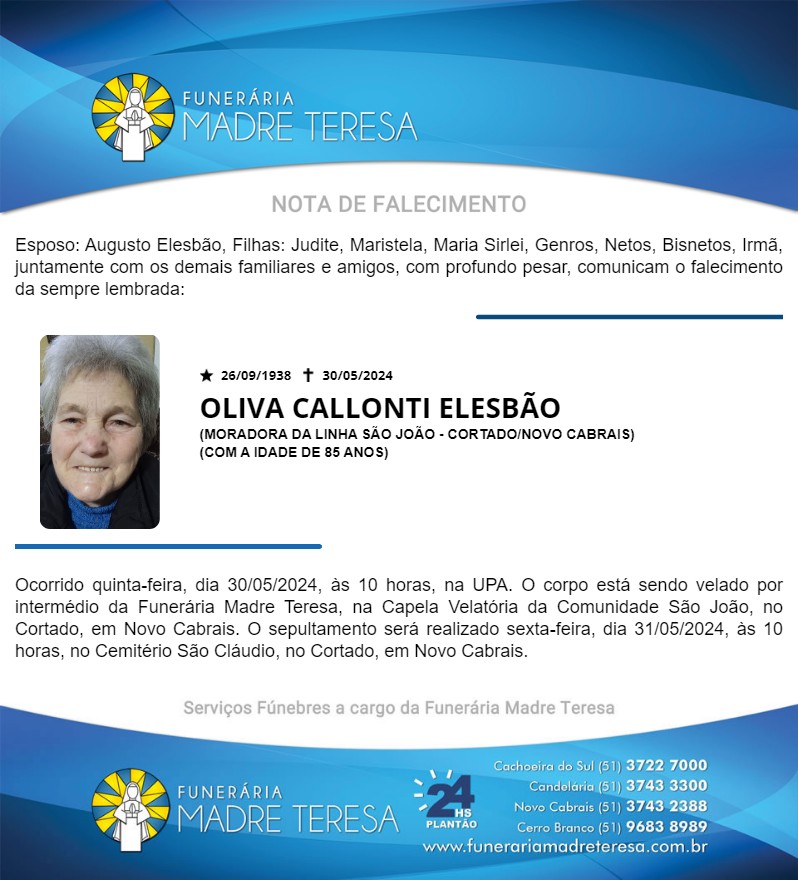 Falecimentos OLIVIA CALLONTI ELESBÃO Francis Soares 31 de maio de 2024 Post navigation Previous: EVA NUNES DE SOUZANext: ALDOMIRO VIEGAS Mais notícias Falecimentos MARION DA SILVA (SÃO NUNCA) Francis Soares 21 de fevereiro de 2025 Falecimentos ROMANI KEGLER NUNES Francis Soares 17 de fevereiro de 2025 Falecimentos ROMARINO “EDILON CARDOSO” PEREIRA Francis Soares 17 de fevereiro de 2025 Deixe um comentário Cancelar respostaO seu endereço de e-mail não será publicado. Campos obrigatórios são marcados com *Comentário * Nome * E-mail * Site Salvar meus dados neste navegador para a próxima vez que eu comentar. Δ