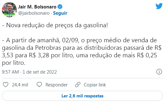 Nesta 5ª feira (1º.set) a Petrobras confirmou a declaração do presidente Jair Bolsonaro (PL) e vai reduzir o preço de venda da gasolina para as distribuidoras em R$ 0,25, por litro, a partir de amanhã (02.set). Ou seja, o preço médio passará de R$ 3,53 para R$ 3,28 por litro.
