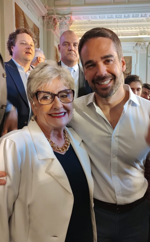 A prefeita Angela Schuh e o secretário de Agricultura e Pecuária, Fernando Cantarelli, marcaram presença na manhã de quinta-feira, 29, no Palácio Piratini, durante o anúncio do investimento de mais de 200 milhões de reais pelo Governo do Estado para a subvenção de projetos de irrigação na etapa 2 do Supera Estiagem. O evento contou com a presença do Governador Eduardo Leite, do vice-governador Gabriel Souza, do presidente da Assembleia Legislativa, deputado estadual Adolfo Brito, de secretários estaduais, prefeitos e lideranças do setor agrícola.