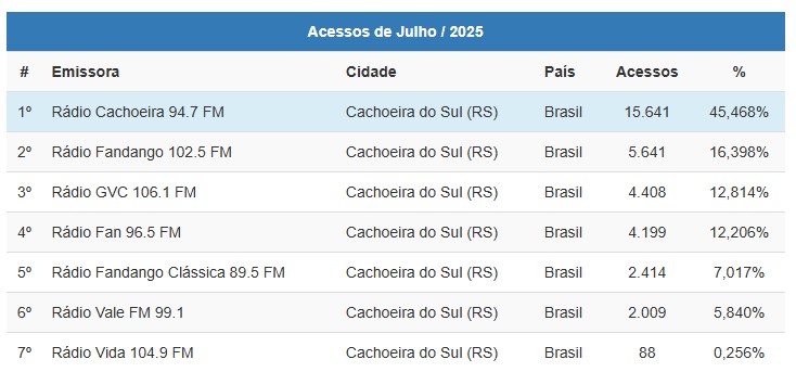 A preferência do público cachoeirense segue inabalável: a Rádio Cachoeira 94.7 FM encerrou o mês de julho de 2025 novamente no topo do ranking de acessos entre as emissoras da cidade. Com impressionantes 15.641 acessos, a rádio liderou com ampla margem, alcançando 45,468% do total registrado no período.