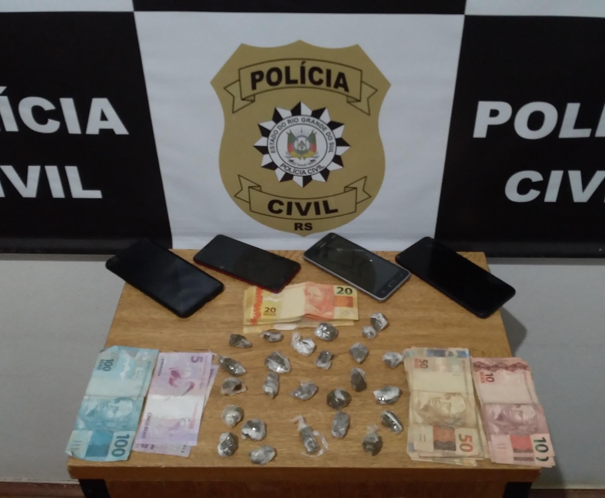 Por meio de investigação, a Polícia Civil, com apoio da Brigada Militar, efetuou as prisões na Av. Júlio de Castilhos, quando foi apreendido R$ 1,5 mil, quatro aparelhos de telefone celular e porções de maconha fracionadas para comercialização.