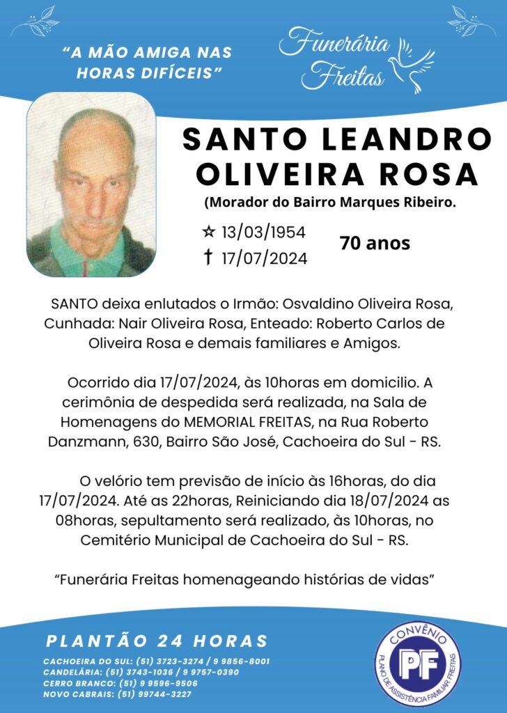 Falecimentos SANDRO LEANDRO OLIVEIRA ROSA Francis Soares 18 de julho de 2024 NOSSOS SINCEROS SENTIMENTOS AOS AMIGOS E FAMILIARES. Post navigation Previous: Em crise, Grêmio faz pior sequência no Brasileirão e vê situação difícil na tabelaNext: Calçados Cachoeira Recebe Currículos e Inicia Processo Seletivo Mais notícias Falecimentos MARION DA SILVA (SÃO NUNCA) Francis Soares 21 de fevereiro de 2025 Falecimentos ROMANI KEGLER NUNES Francis Soares 17 de fevereiro de 2025 Falecimentos ROMARINO “EDILON CARDOSO” PEREIRA Francis Soares 17 de fevereiro de 2025 Deixe um comentário Cancelar respostaO seu endereço de e-mail não será publicado. Campos obrigatórios são marcados com *Comentário * Nome * E-mail * Site Salvar meus dados neste navegador para a próxima vez que eu comentar. Δ