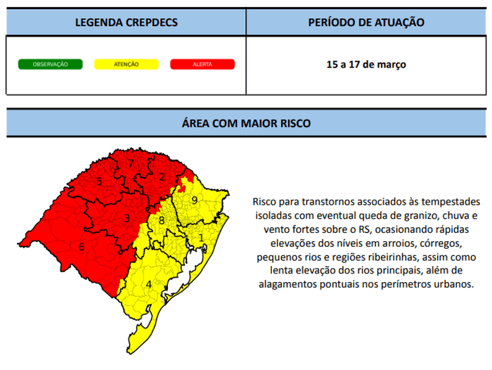 Secretaria do Meio Ambiente e Infraestrutura do Rio Grande do Sul (Sema RS) emitiu um alerta que indica a possibilidade de tempestades, chuva forte e queda de granizo nos próximos dias em todo o território gaúcho. Uma área de baixa pressão, o fluxo de umidade e o avanço de uma frente fria sobre o oceano são os motivos da instabilidade. O aviso tem validade até domingo (17).