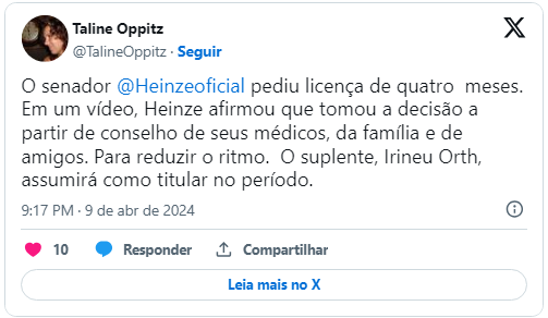 Senador Heinze anuncia licença de quatro meses para “reduzir ritmo”