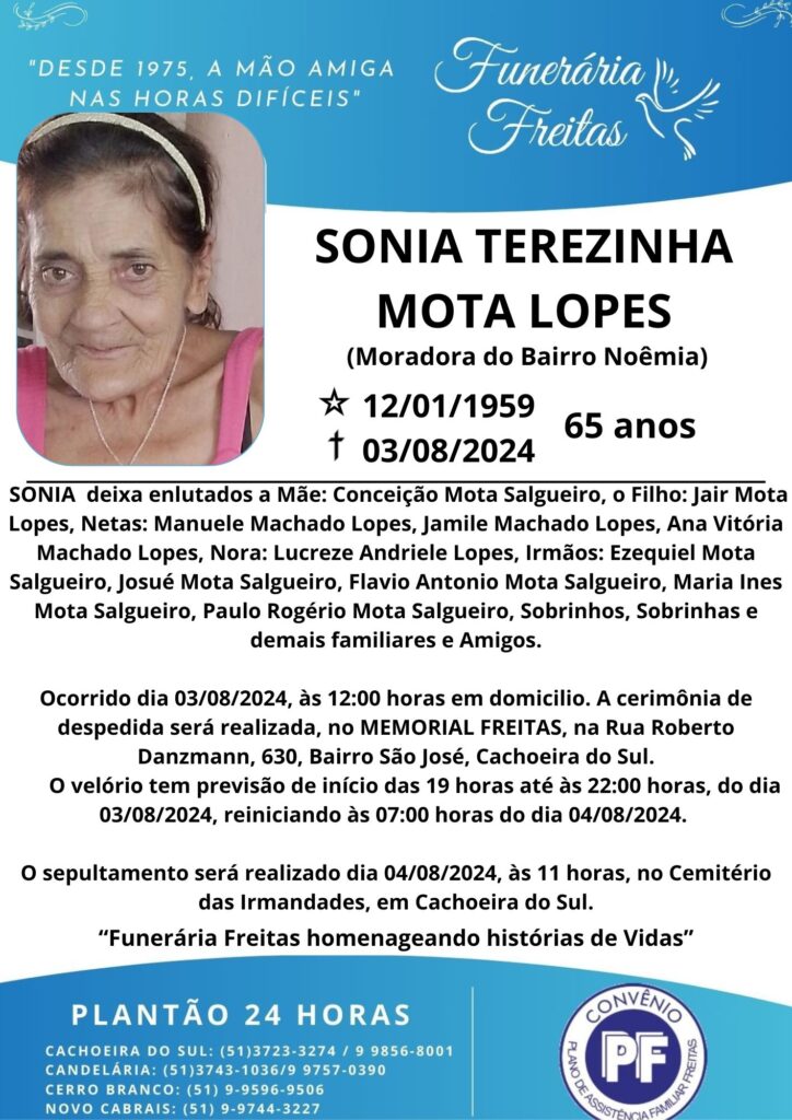 Falecimentos SONIA TEREZINHA MOTA LOPES Francis Soares 6 de agosto de 2024 Post navigation Previous: MATILDE DE OLIVEIRA MORAISNext: WILLI TROJAHN Mais notícias Falecimentos MARION DA SILVA (SÃO NUNCA) Francis Soares 21 de fevereiro de 2025 Falecimentos ROMANI KEGLER NUNES Francis Soares 17 de fevereiro de 2025 Falecimentos ROMARINO “EDILON CARDOSO” PEREIRA Francis Soares 17 de fevereiro de 2025 Deixe um comentário Cancelar respostaO seu endereço de e-mail não será publicado. Campos obrigatórios são marcados com *Comentário * Nome * E-mail * Site Salvar meus dados neste navegador para a próxima vez que eu comentar. Δ
