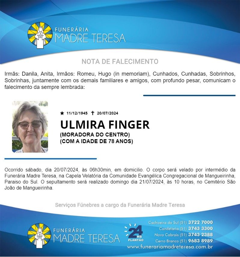 Falecimentos ULMIRA FINGER Francis Soares 20 de julho de 2024 NOSSOS SINCEROS SENTIMENTOS AOS FAMILIARES E AMIGOS. Post navigation Previous: MIGUEL CELSO LISBOA DE CARVALHONext: JORGE LUIZ FLORES BARBOSA Mais notícias Falecimentos MARION DA SILVA (SÃO NUNCA) Francis Soares 21 de fevereiro de 2025 Falecimentos ROMANI KEGLER NUNES Francis Soares 17 de fevereiro de 2025 Falecimentos ROMARINO “EDILON CARDOSO” PEREIRA Francis Soares 17 de fevereiro de 2025 Deixe um comentário Cancelar respostaO seu endereço de e-mail não será publicado. Campos obrigatórios são marcados com *Comentário * Nome * E-mail * Site Salvar meus dados neste navegador para a próxima vez que eu comentar. Δ