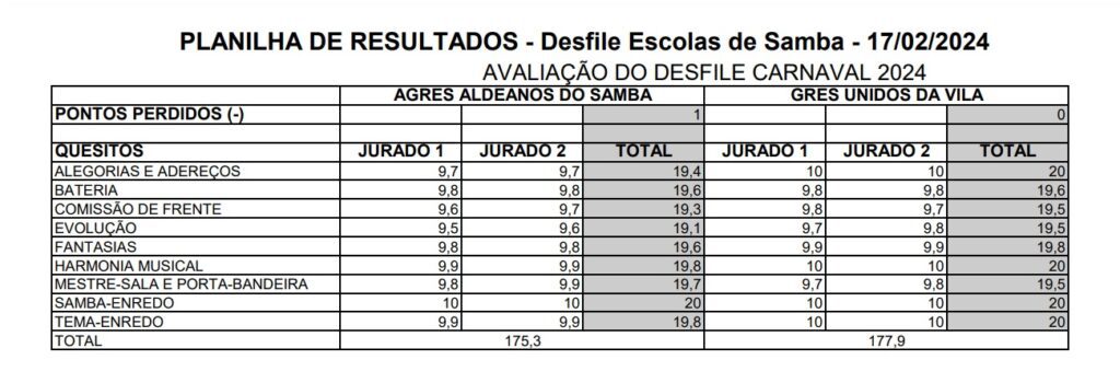 Os jurados, indicados pela AJUCEPERGS – Associação de Jurados de Carnaval e Eventos Populares do Rio Grande do Sul, responsável por julgar os maiores carnavais do estado, deram suas notas para os quesitos Alegorias e Adereços, Bateria, Comissão de Frente, Evolução, Fantasias, Harmonia Musical, Mestre-Sala e Porta-Bandeira, Samba-Enredo, Tema-Enredo.