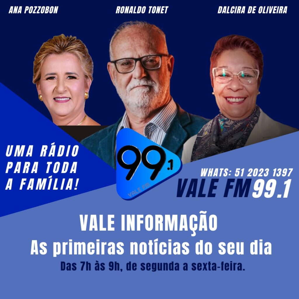 Você está convidado para a estreia do “Vale Informação” na próxima segunda-feira, dia 13, das 7h às 9h, na Rádio Vale 99.1 FM. As participações podem ser feitas através do WhatsApp, no número (51) 2023-1397.