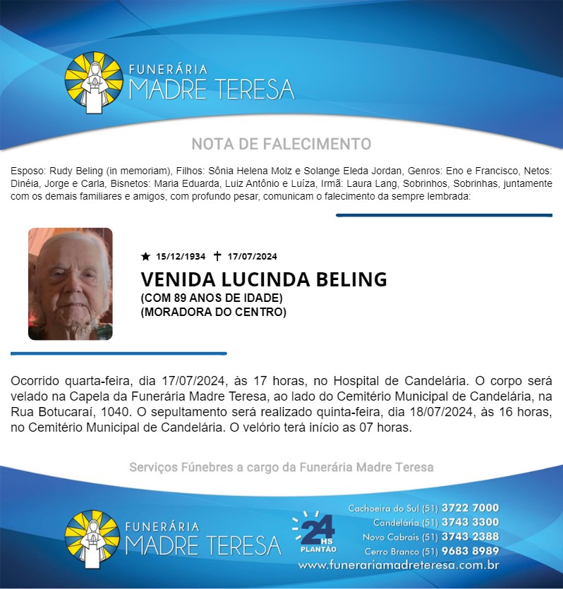 Falecimentos VENIDA LUCINDA BELING Francis Soares 18 de julho de 2024 NOSSOS SINCEROS SENTIMENTOS AOS AMIGOS E FAMILIARES. Post navigation Previous: ALBA CONCEIÇÃO GASPARI BECKNext: ANGELO NUNES Mais notícias Falecimentos MARION DA SILVA (SÃO NUNCA) Francis Soares 21 de fevereiro de 2025 Falecimentos ROMANI KEGLER NUNES Francis Soares 17 de fevereiro de 2025 Falecimentos ROMARINO “EDILON CARDOSO” PEREIRA Francis Soares 17 de fevereiro de 2025 Deixe um comentário Cancelar respostaO seu endereço de e-mail não será publicado. Campos obrigatórios são marcados com *Comentário * Nome * E-mail * Site Salvar meus dados neste navegador para a próxima vez que eu comentar. Δ