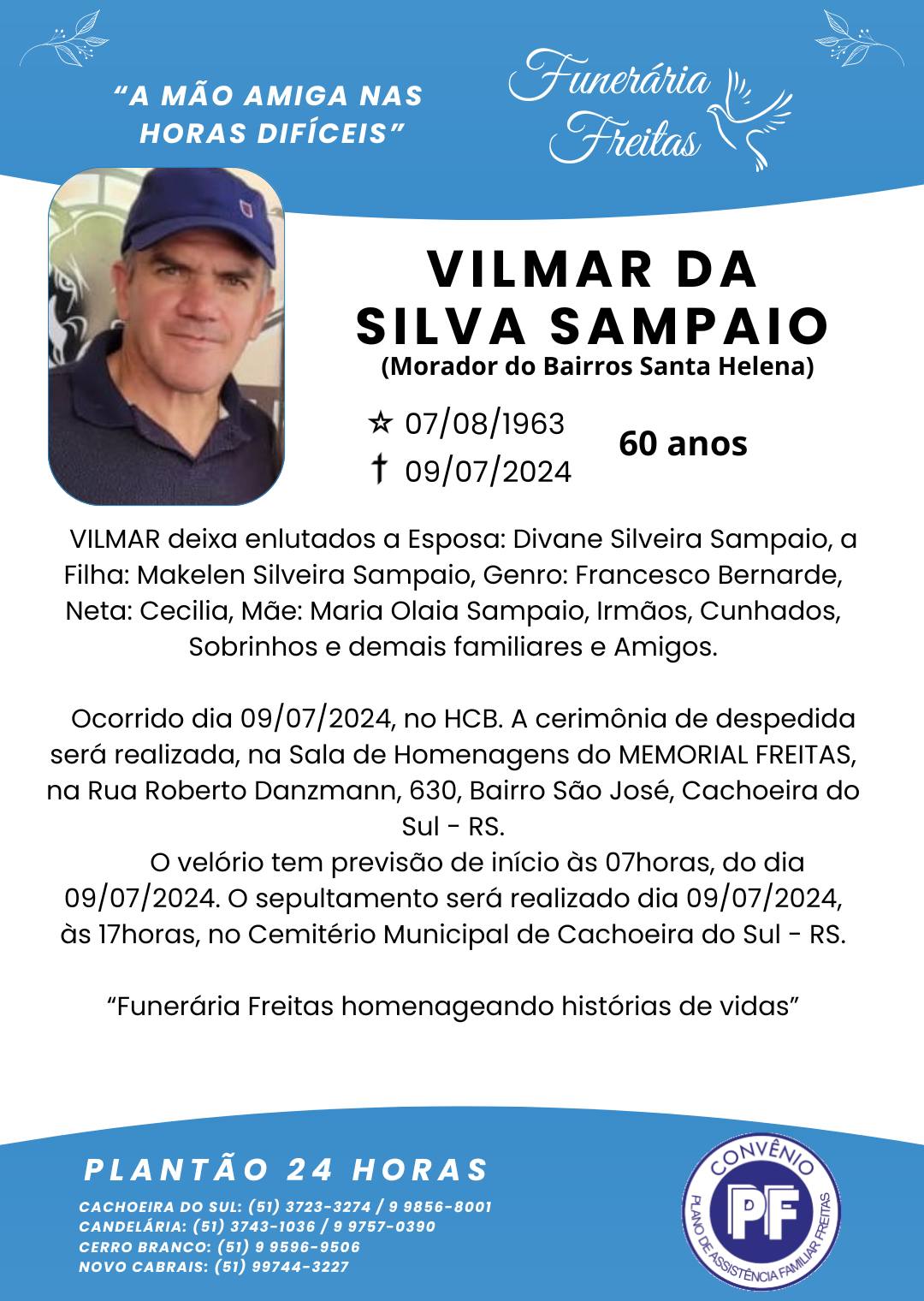 Falecimentos VILMAR DA SILVA SAMPAIO Francis Soares 11 de julho de 2024 NOSSOS SINCEROS SENTIMENTOS AOS FAMILIARES E AMIGOS! Post navigation Previous: HÉLIO GOMES DE FREITASNext: Novos servidores da educação são empossados em Cachoeira. CONFIRA! Mais notícias Falecimentos MARION DA SILVA (SÃO NUNCA) Francis Soares 21 de fevereiro de 2025 Falecimentos ROMANI KEGLER NUNES Francis Soares 17 de fevereiro de 2025 Falecimentos ROMARINO “EDILON CARDOSO” PEREIRA Francis Soares 17 de fevereiro de 2025 Deixe um comentário Cancelar respostaO seu endereço de e-mail não será publicado. Campos obrigatórios são marcados com *Comentário * Nome * E-mail * Site Salvar meus dados neste navegador para a próxima vez que eu comentar. Δ