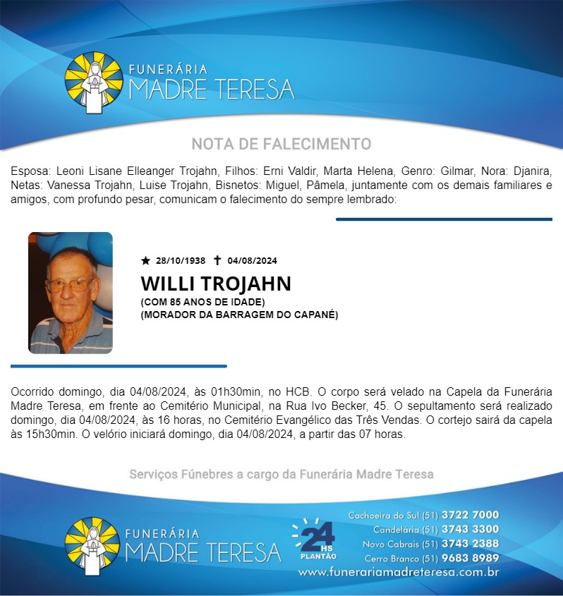 Uncategorized WILLI TROJAHN Francis Soares 6 de agosto de 2024 Post navigation Previous: SONIA TEREZINHA MOTA LOPESNext: IVAN LUIS JANNER Mais notícias Uncategorized Rio Jacuí ultrapassa 25 metros e cheia já é uma das maiores da história de Cachoeira do Sul. Rafael Bordignon 20 de junho de 2025 Uncategorized Chuva de meteoros Eta Aquáridas atinge pico na madrugada desta terça; saiba como observar Francis Soares 6 de maio de 2025 Uncategorized Decisão Revoga Prisão Domiciliar de Edelvania Wirganovicz Francis Soares 25 de fevereiro de 2025 Deixe um comentário Cancelar respostaO seu endereço de e-mail não será publicado. Campos obrigatórios são marcados com *Comentário * Nome * E-mail * Site Salvar meus dados neste navegador para a próxima vez que eu comentar. Δ